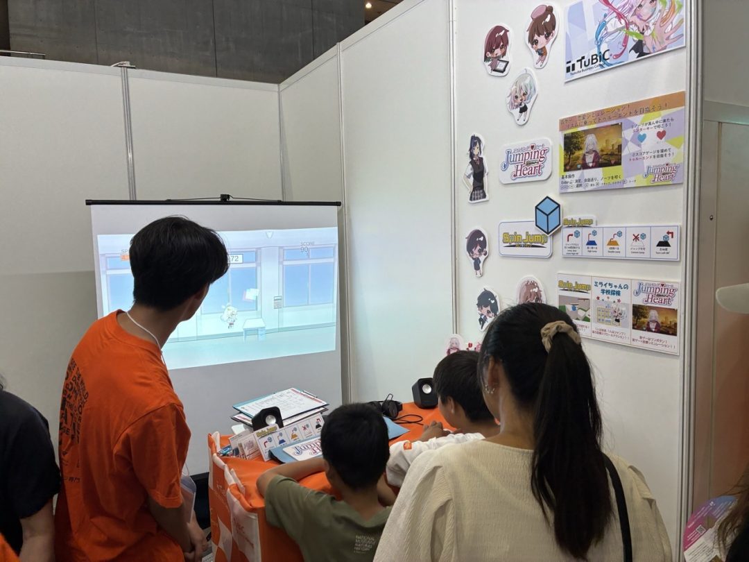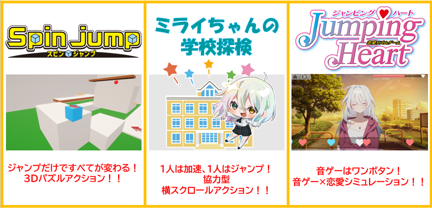 本校では、「簡単1ボタンで楽しめる」をキーワードに、仲間と協力して進む横スクロールアクション、ジャンプがすべてを決めるパズルアクション、恋の行方がリズムで決まる恋愛リズムゲーム の3作品を展示し、たくさんのお客様に遊んでいただきました。