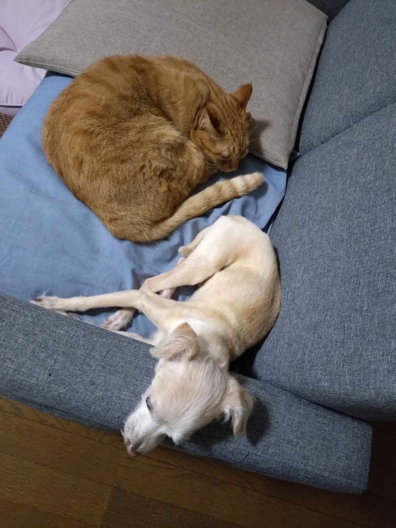 寒くなってきたから、もうちょっとくっついたらいいのに🐕🐈