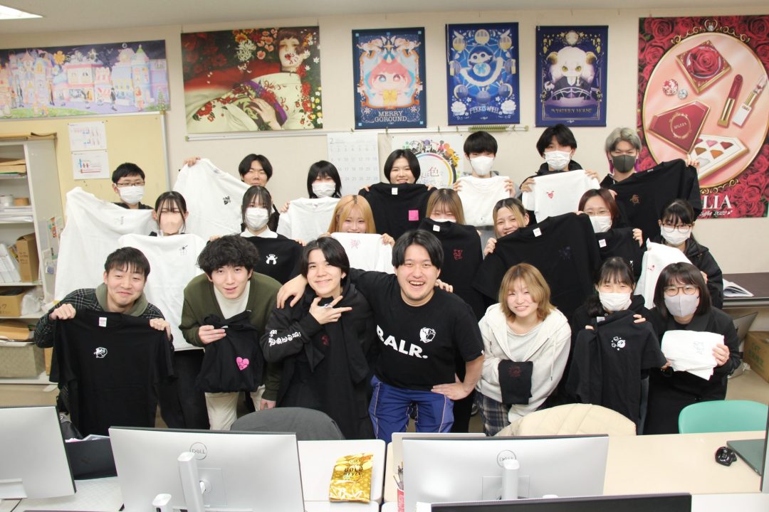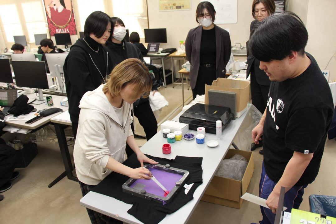 グラフィックデザインコースの1年生は、毎年恒例となってきているTシャツのワンポイントロゴをデザインし、それを実際に印刷してみるという実習を行い、講師として卒業生である腕井亭打撲先生に来校していただきました。